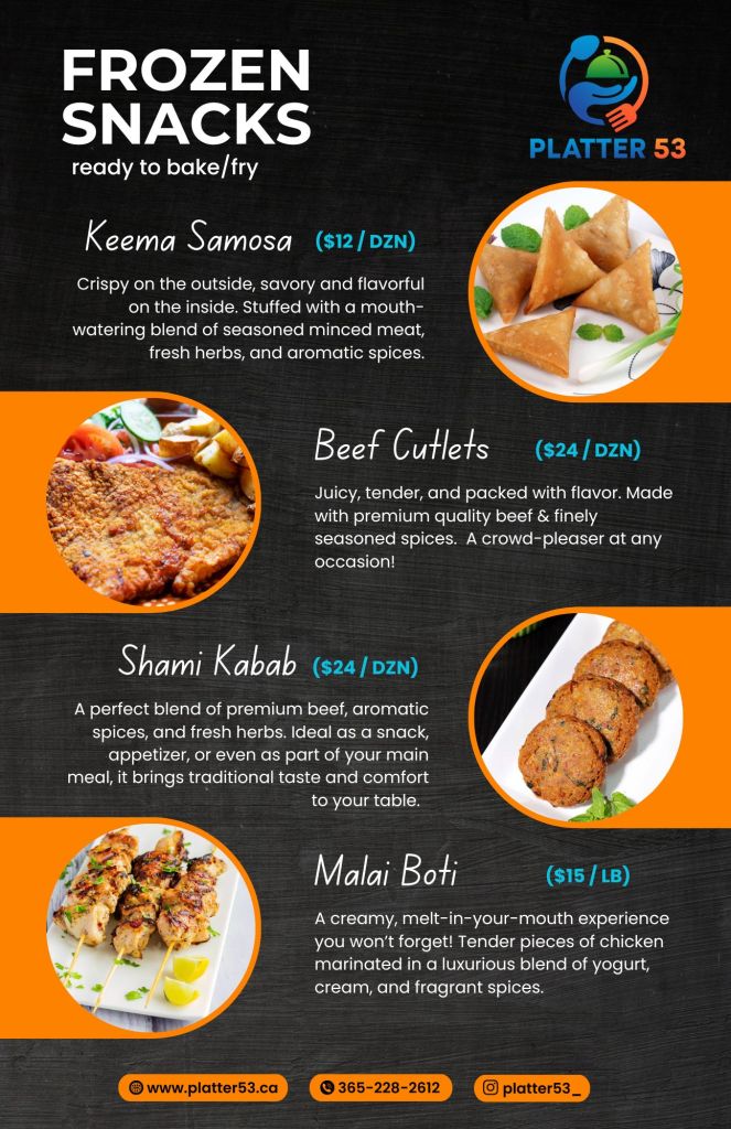 Platter53’s frozen ready-to-bake, fry, or cook meals bring the convenience of delicious, homemade dining straight to your kitchen. Each meal is carefully prepared with high-quality ingredients, then frozen to lock in freshness and flavor, so you can enjoy a gourmet experience at your convenience. Whether you prefer to bake, fry, or cook, our range of frozen options allows you to effortlessly prepare a wide variety of dishes, from savory mains to indulgent sides. Perfect for busy days, spontaneous gatherings, or when you’re craving a hassle-free meal, Platter53 makes it easy to enjoy flavorful, restaurant-quality dishes with minimal effort and maximum satisfaction.
